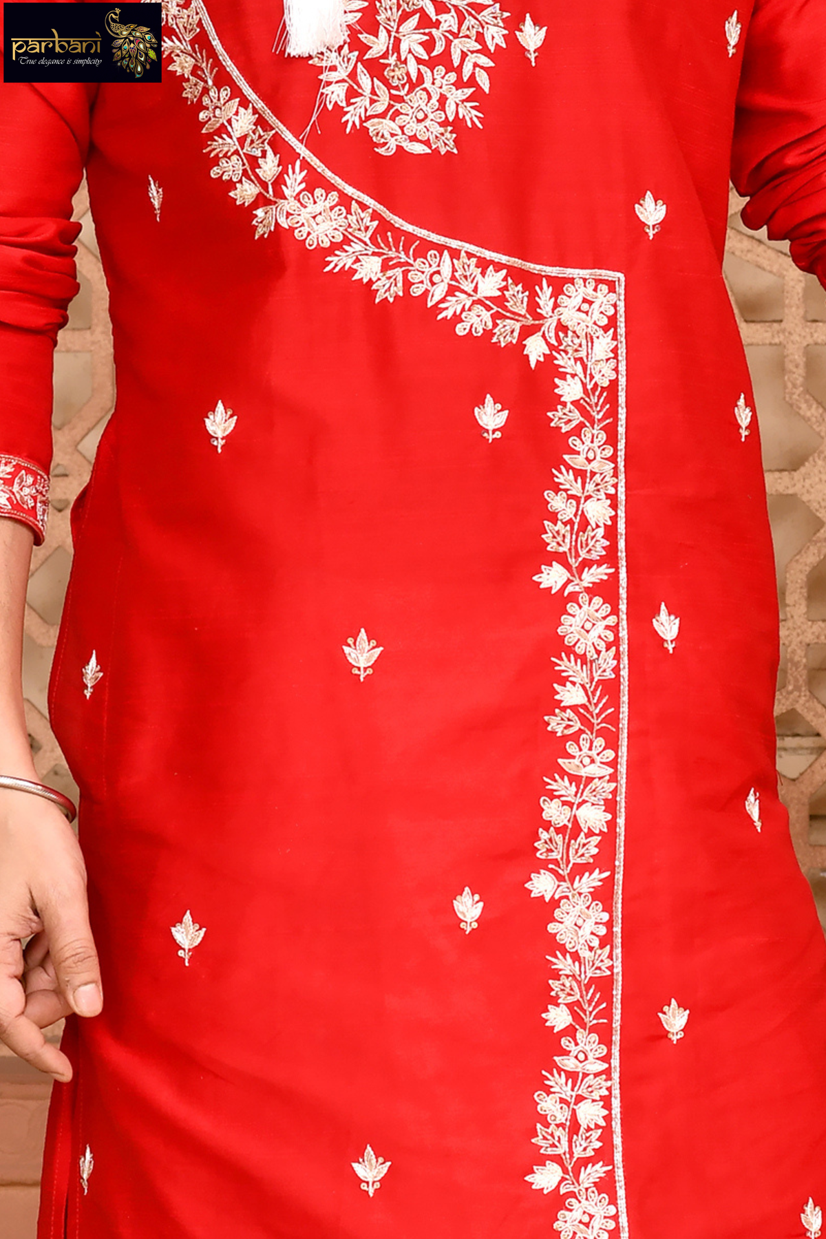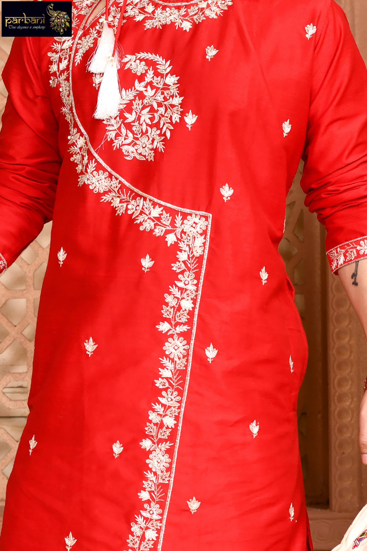 Parbani Men Admirable Red coloured Designer Raw Silk Angarakha Style Kurta With Embroidery Work
