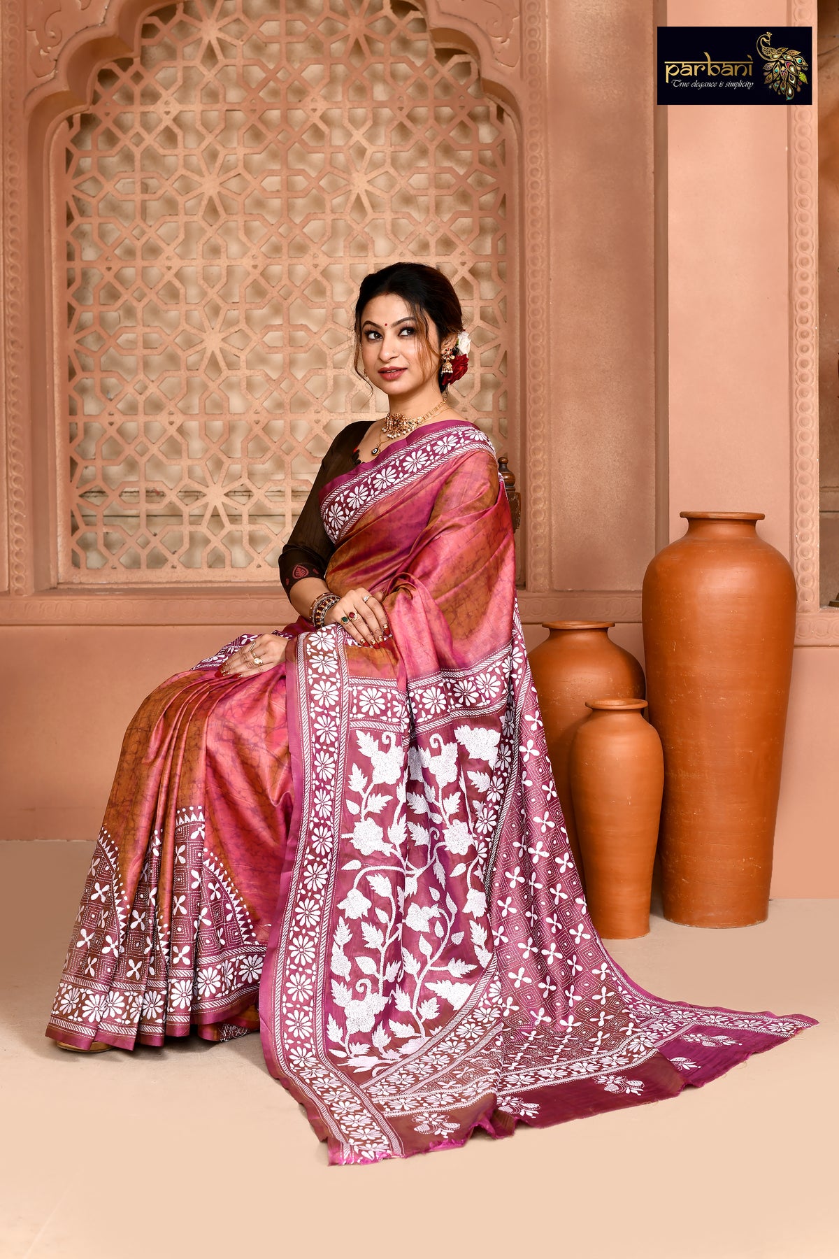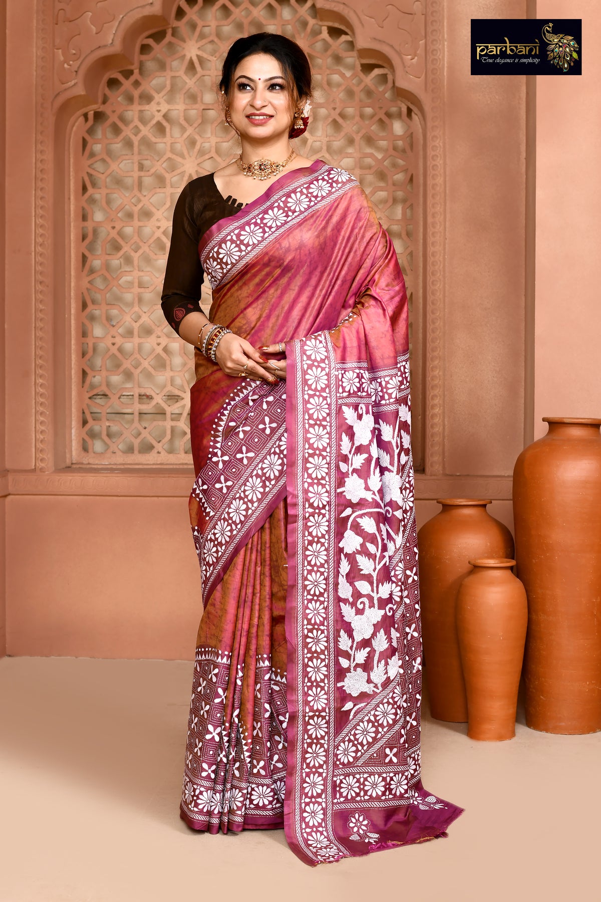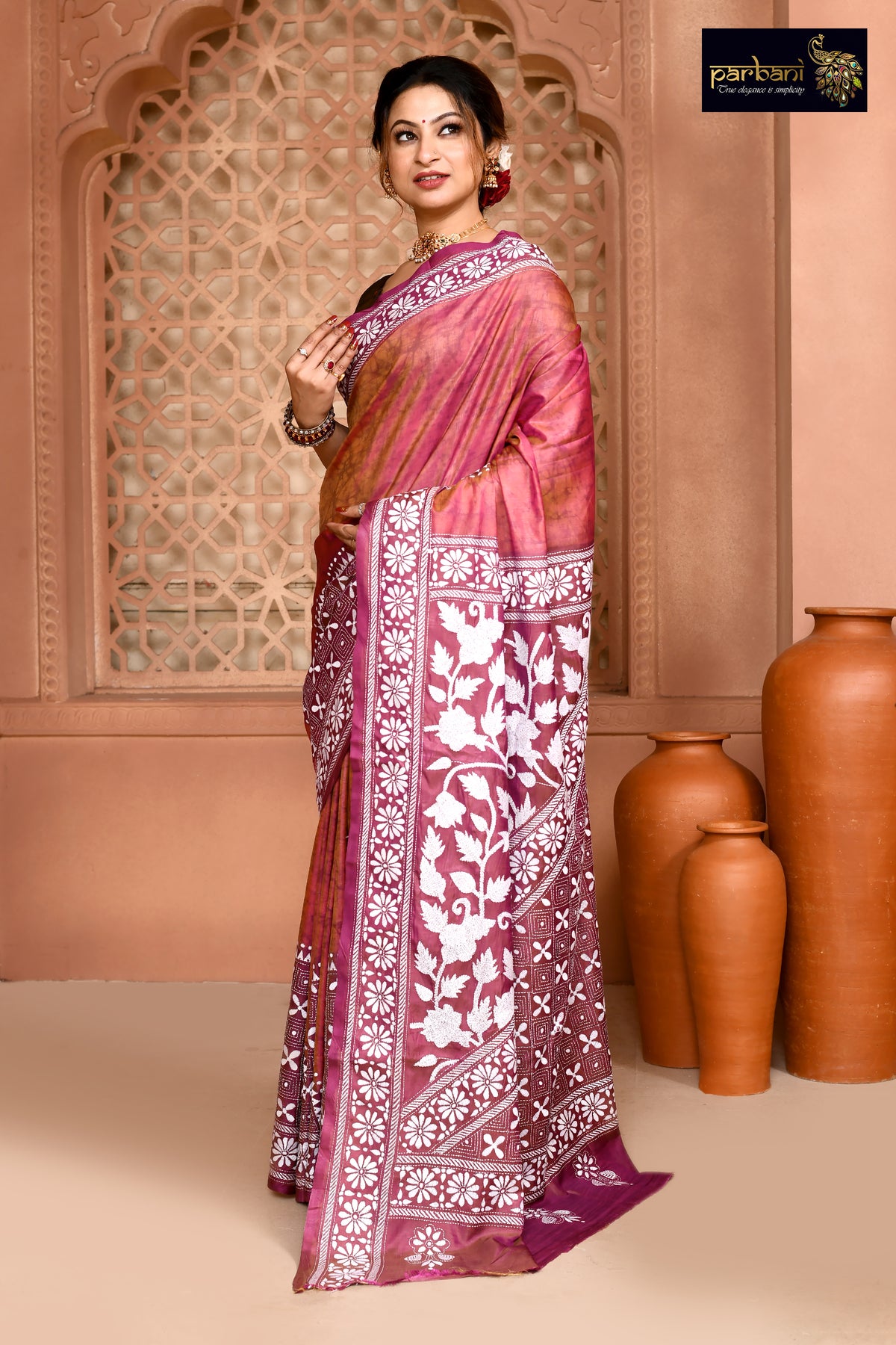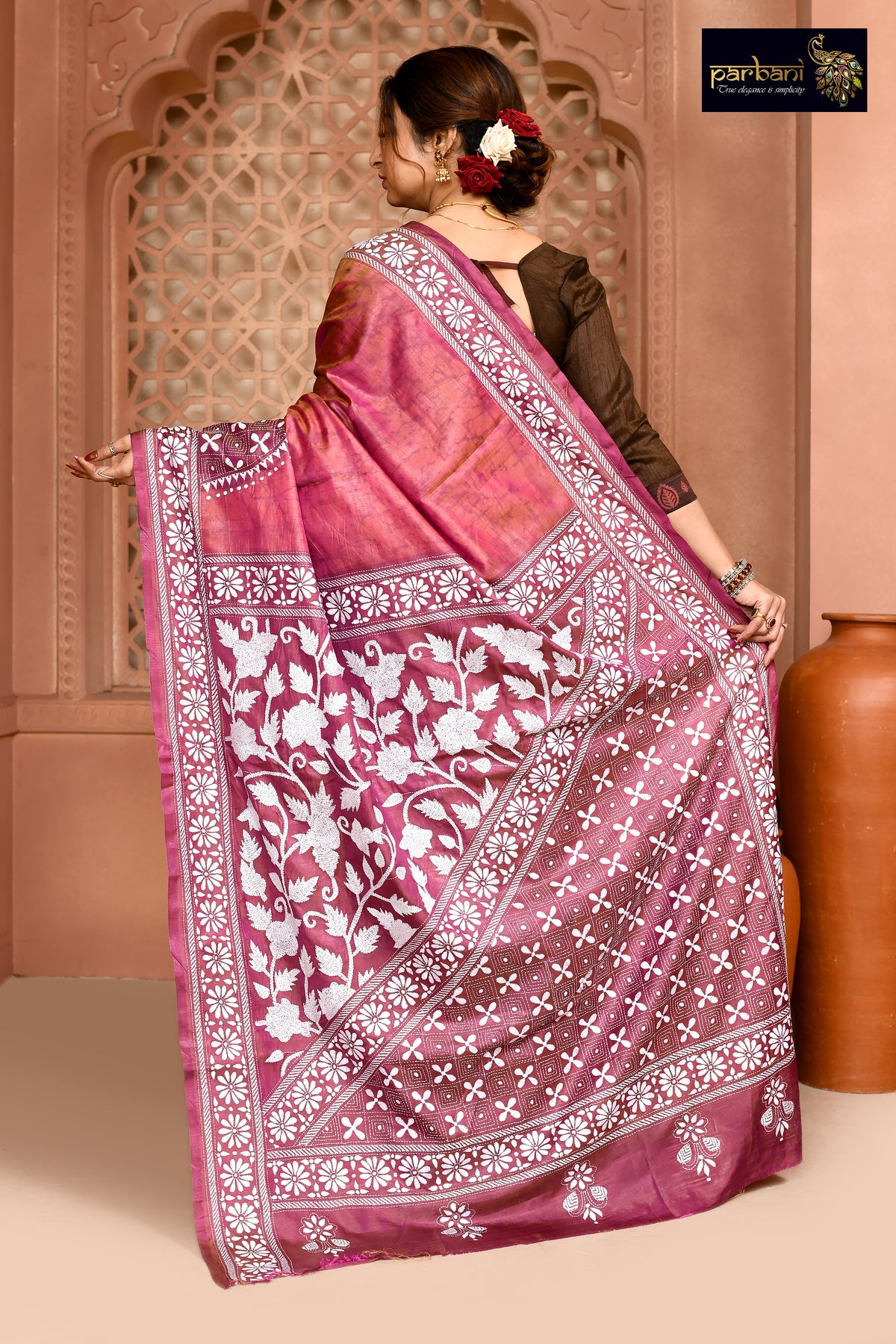 Traditional Dusty Rose Pink Colour Blended Bishnupuri Silk Saree Intricated With Allover Katha Work