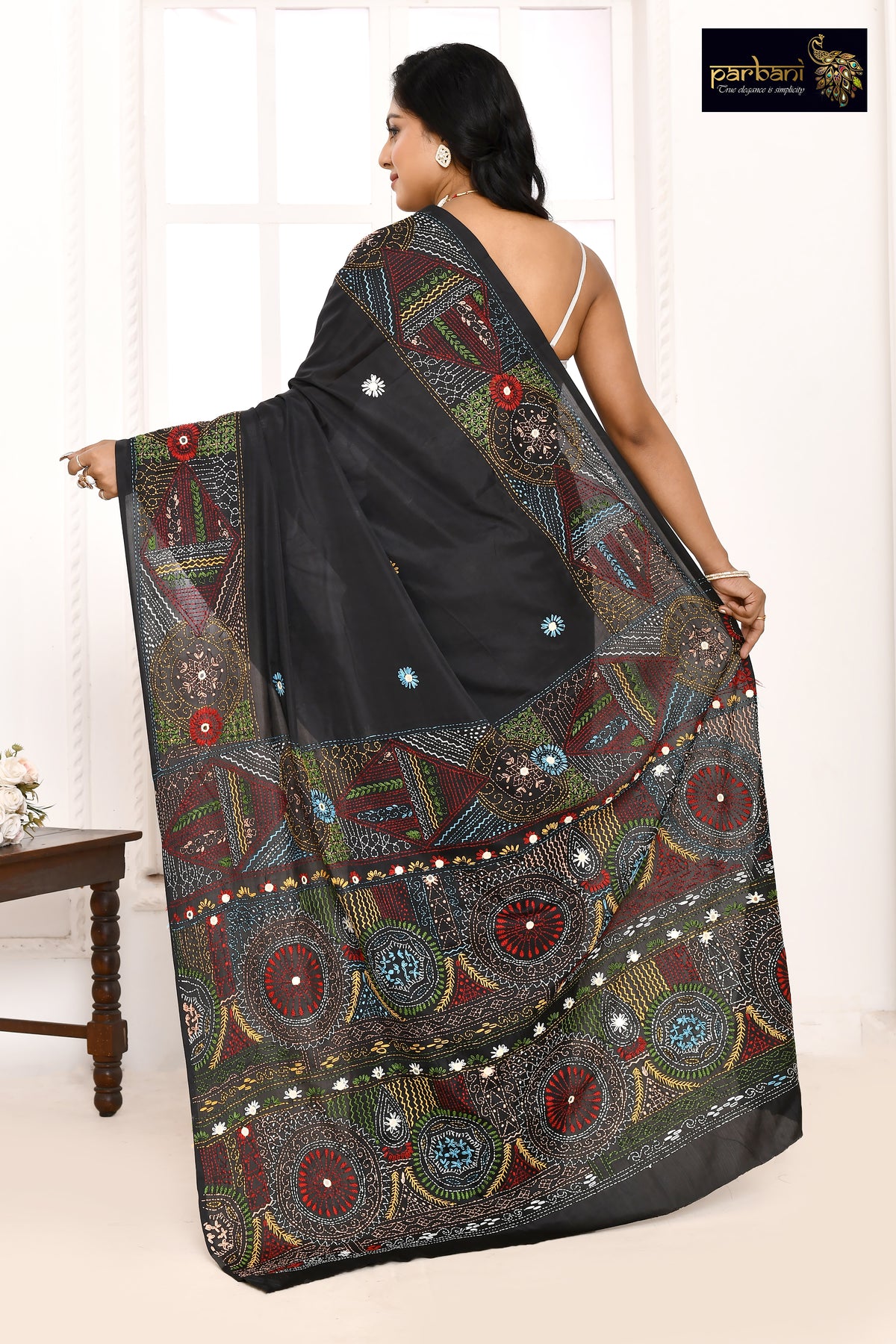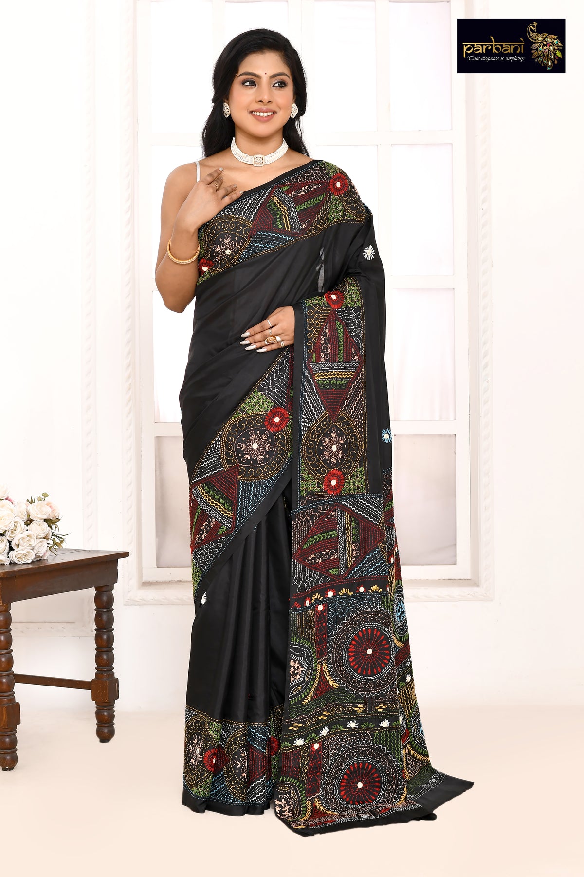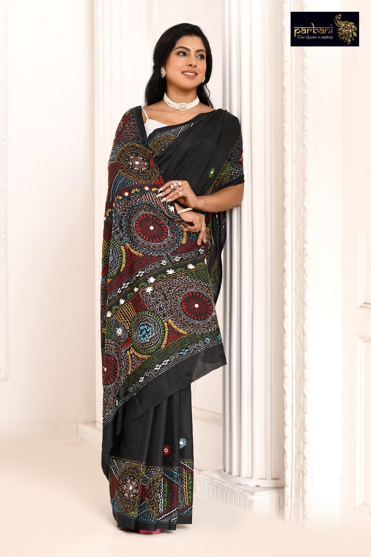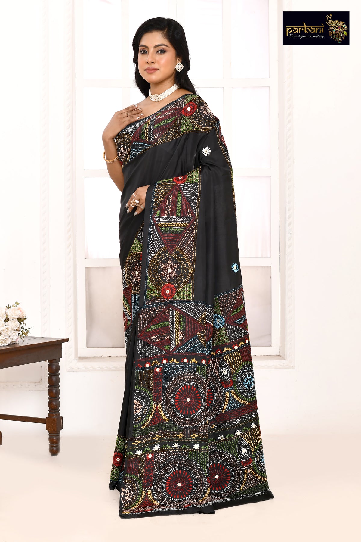 Parbani Women Traditional Black Blended Bangalore Silk Saree Intricated With Authentic Lambani Work