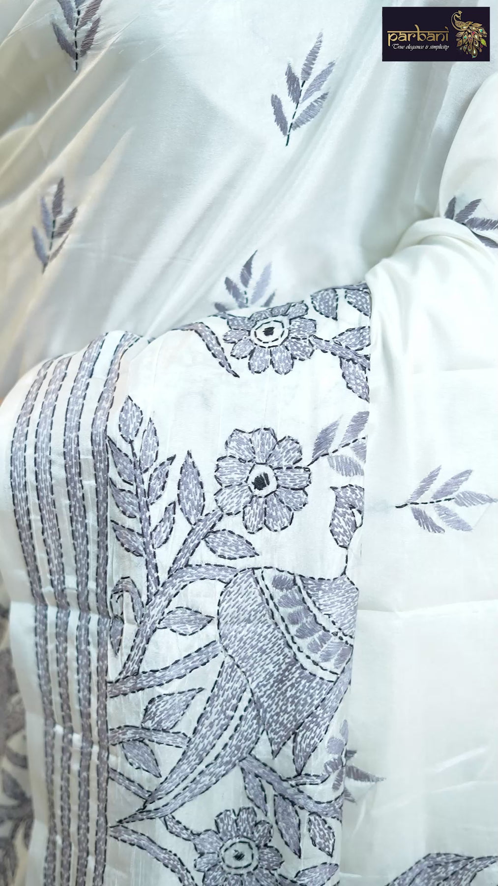 Traditional White Blended Bangalore Silk Saree Intricated With Timeless Katha Artistry