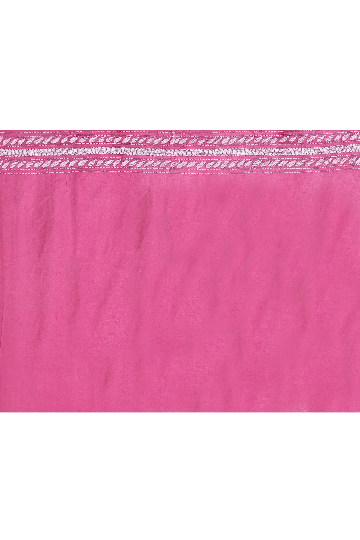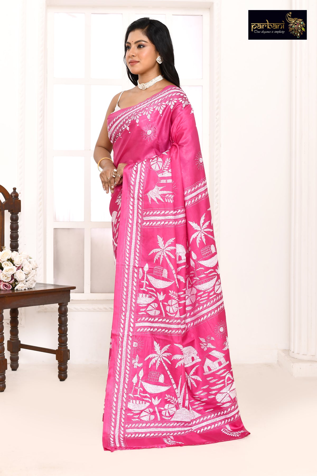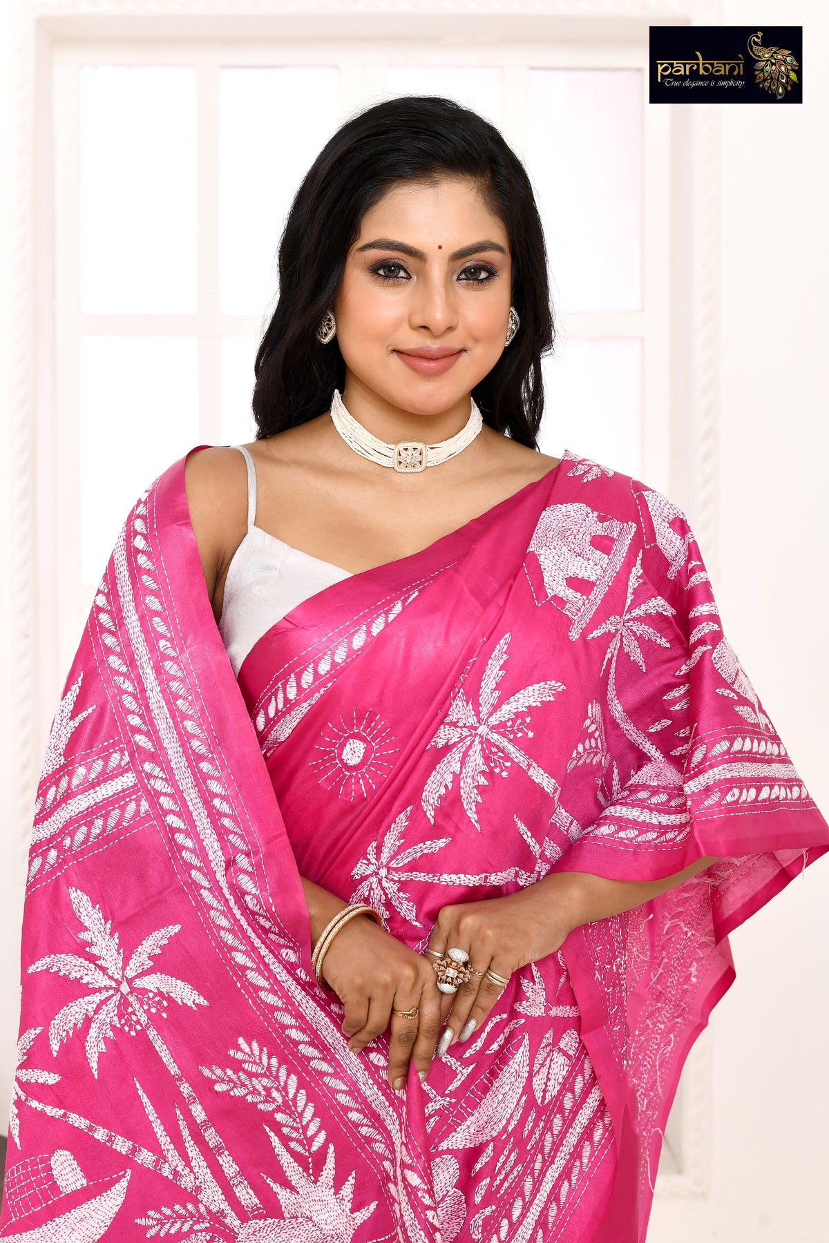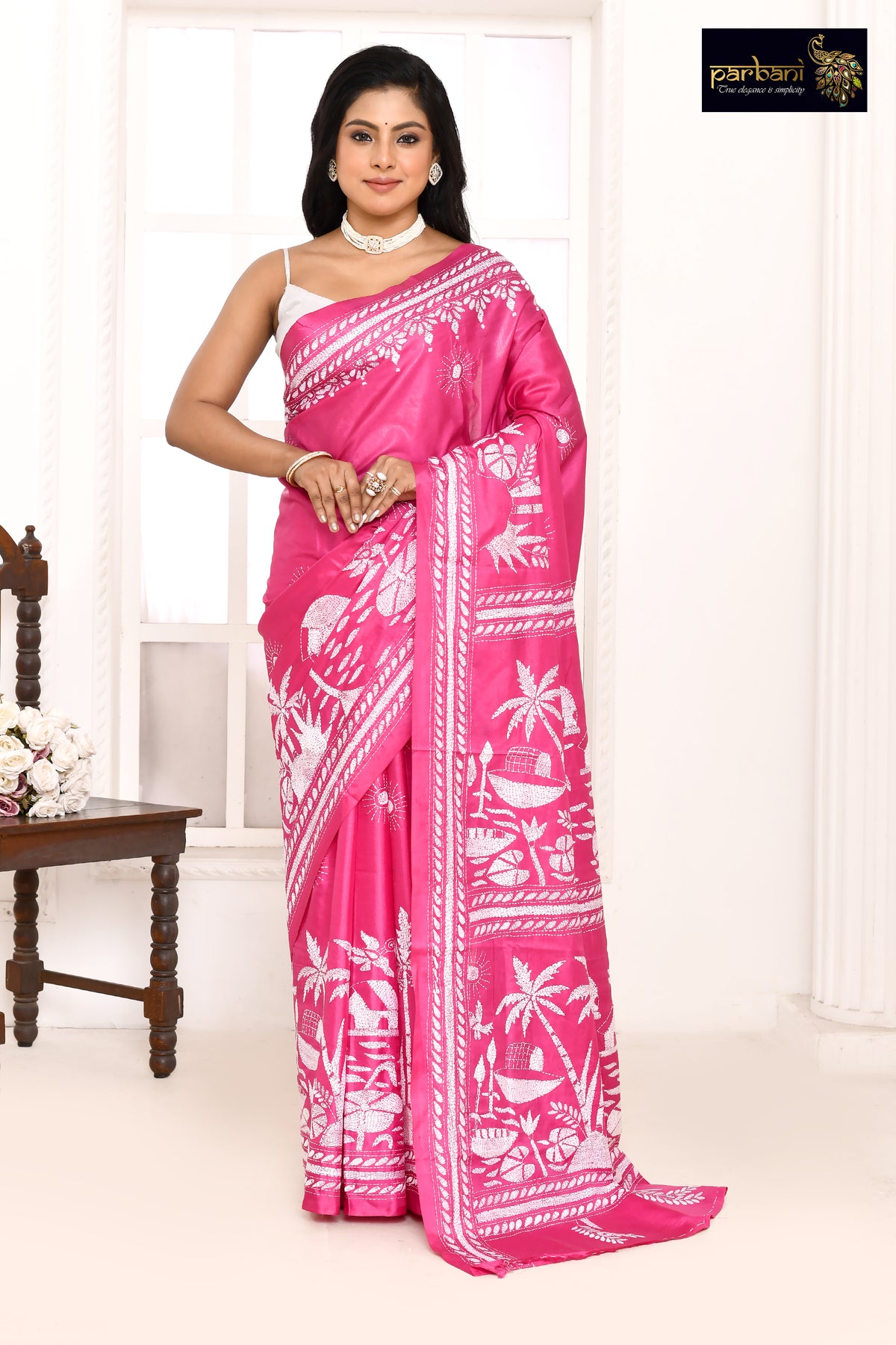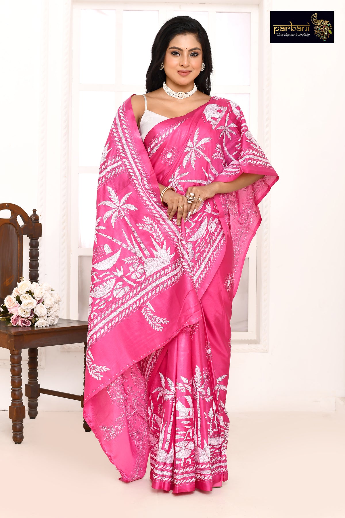 Parbani Women Eloquent Fucia Pink Bangalore Silk Saree With Allover Katha Work